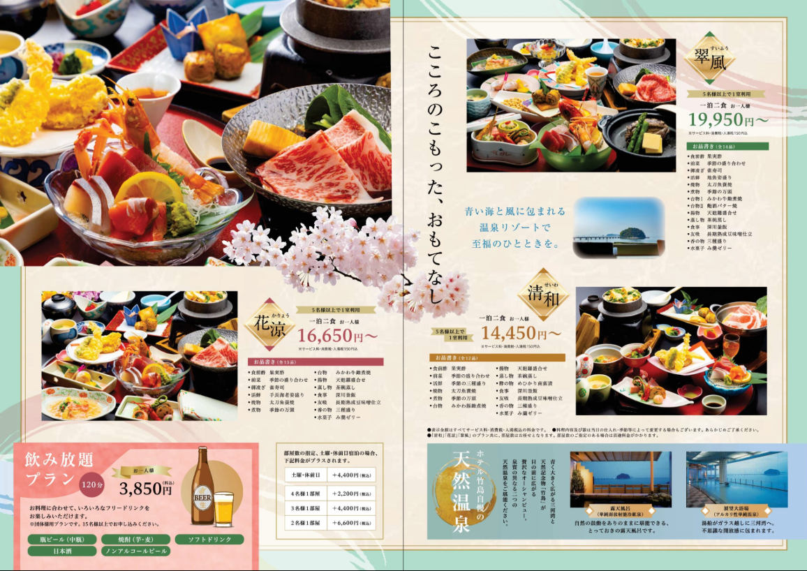 三河湾と竹島を望む全室オーシャンビューの客室で、潮風に包まれながら穏やかな時間をお過ごしください。 天然記念物に囲まれた雄大な景色と心地よい温泉が旅の疲れを癒し、旬の海の幸や地元の恵みを活かした料理が特別なひとときを彩ります。和の寛ぎとおもてなしに満ちた癒しの宿です。